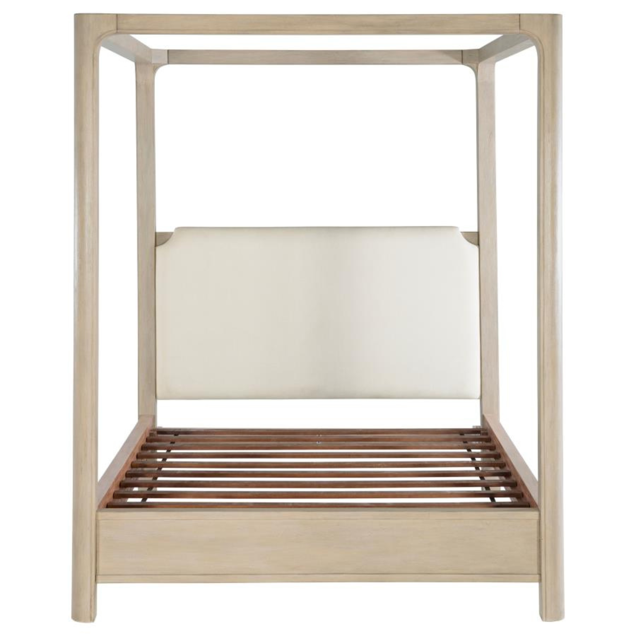Airy and architectural, this canopy bed brings sculptural presence and soft romance to the bedroom. Gracefully arched posts frame a tall silhouette, while an upholstered headboard adds a tailored layer of texture and comfort. Designed with a platform panel base, it offers lasting support without the need for a foundation. Crafted from mahogany, engineered wood, mango veneer, and fabric, this piece blends strength and serenity in perfect harmony.