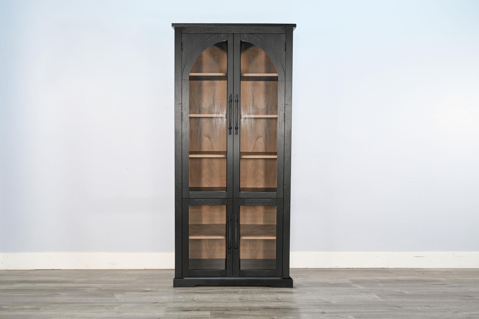 Introducing the Elena arched cabinet in black and natural.  Featuring arched glass front doors, black finish with natural contrast interior shelving.
