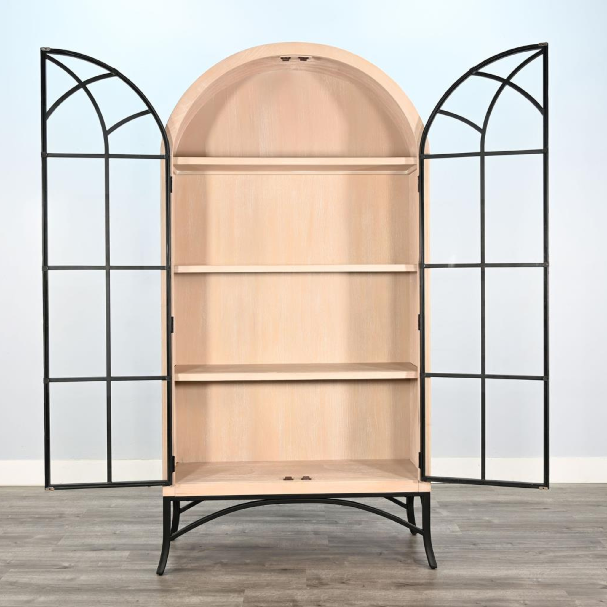 Introducing the Ella arched glass door cabinet in Natural with black metal accent.  Function and style merge perfectly with this beautiful statement piece.  Sturdy construction ample storage.