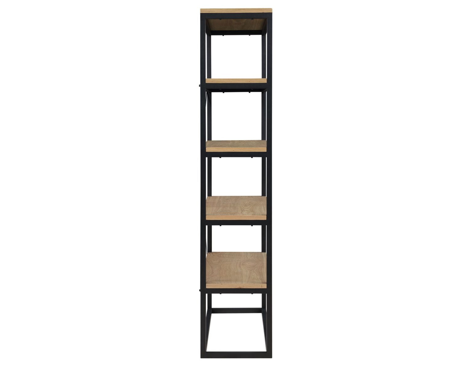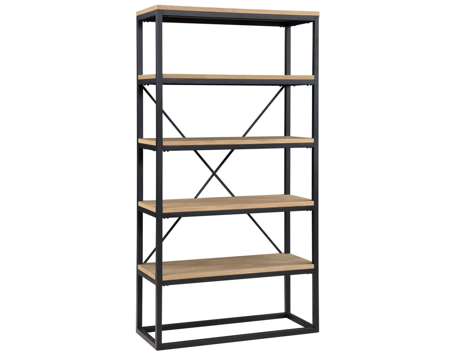 A mixed media bookcase with industrial design bona fides dressed up with a fresh new sand wood finish for today’s interiors. A black metal frame with back stretchers offers sturdy construction and a sleek modern look. Five ash veneered shelvers offer a beautiful contrast while also offering abundant storage for a bedroom, office or dining area.