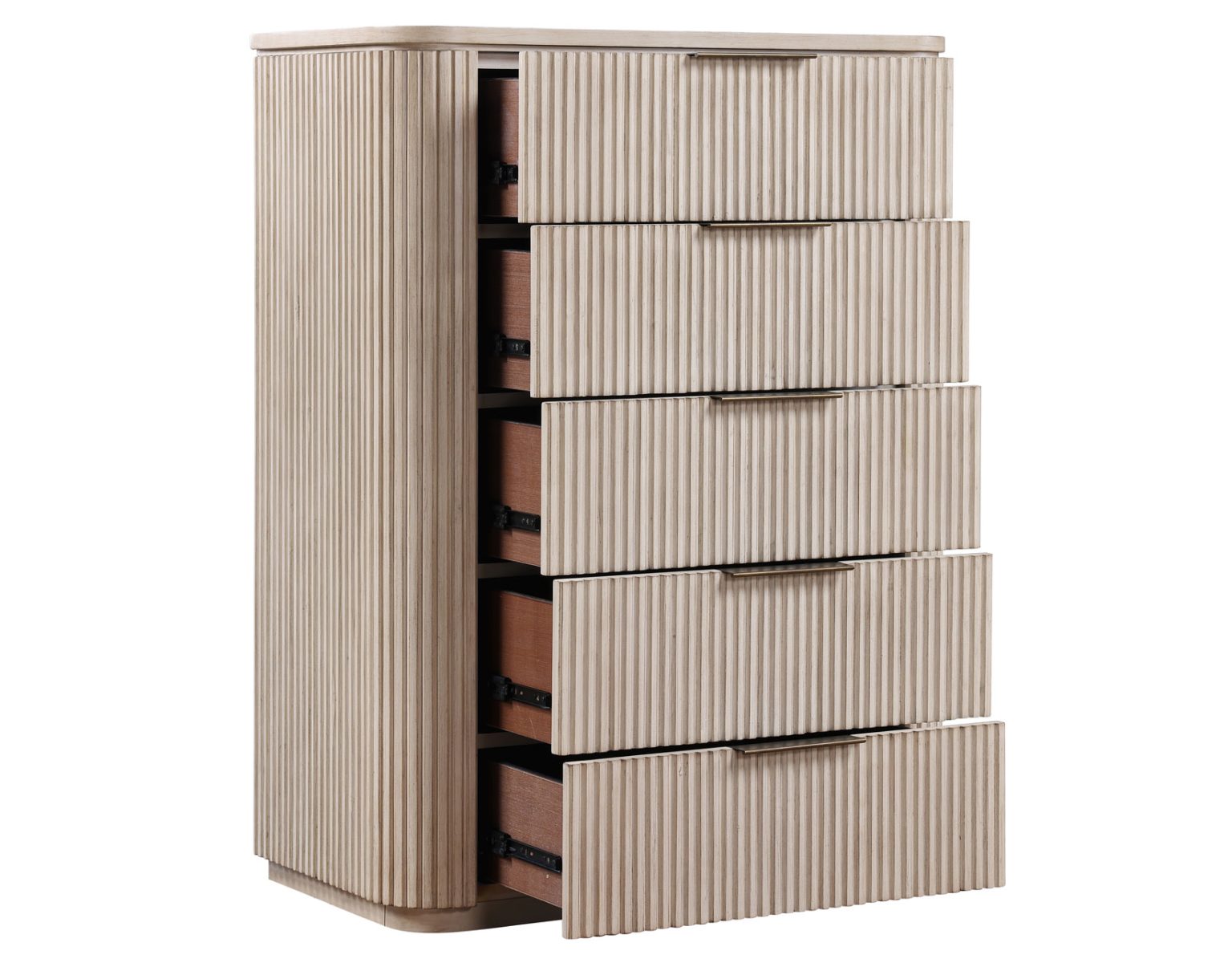 The Henry 5-Drawer Chest combines vertical storage with modern elegance and practicality. Crafted from oak veneers, Asian hardwoods, and engineered woods, it features reeded surfaces, rounded corners, and a sturdy plinth base. Five drawers, including a felt-lined top drawer, offer organized storage, while side metal glides ensure smooth operation and safety stops prevent accidental removal. Constructed with kiln-dried wood and mortise-and-tenon joinery, the chest provides exceptional stability. The hand-stained tan finish highlights the natural grain, and oil-rubbed brass pulls add a stylish touch. An anti-tip restraint kit is included for safety