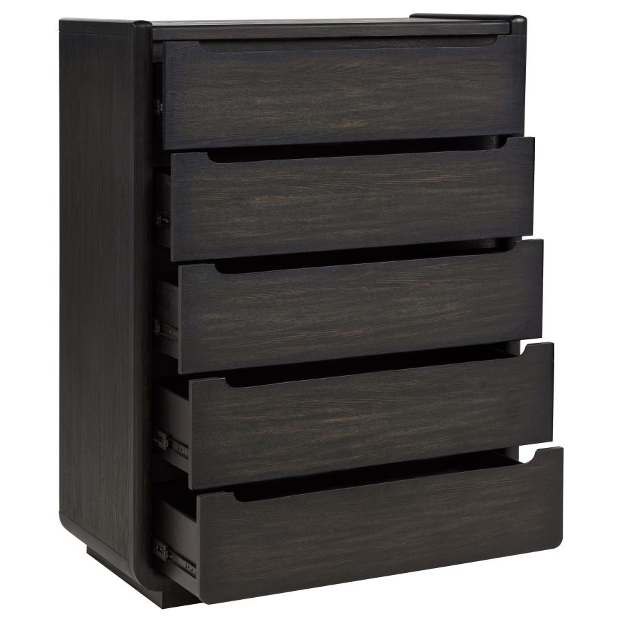 Balance and beauty meet in this five-drawer chest, where softened curves and a deep burnished black finish bring quiet depth to the room. Recessed pulls and rounded corners echo a modern sensibility, while black felt-lined top drawers protect what matters most. Designed with English dovetail joinery, soft-closing glides, and a fully enclosed dust panel, this tall silhouette blends sculptural refinement with everyday function.