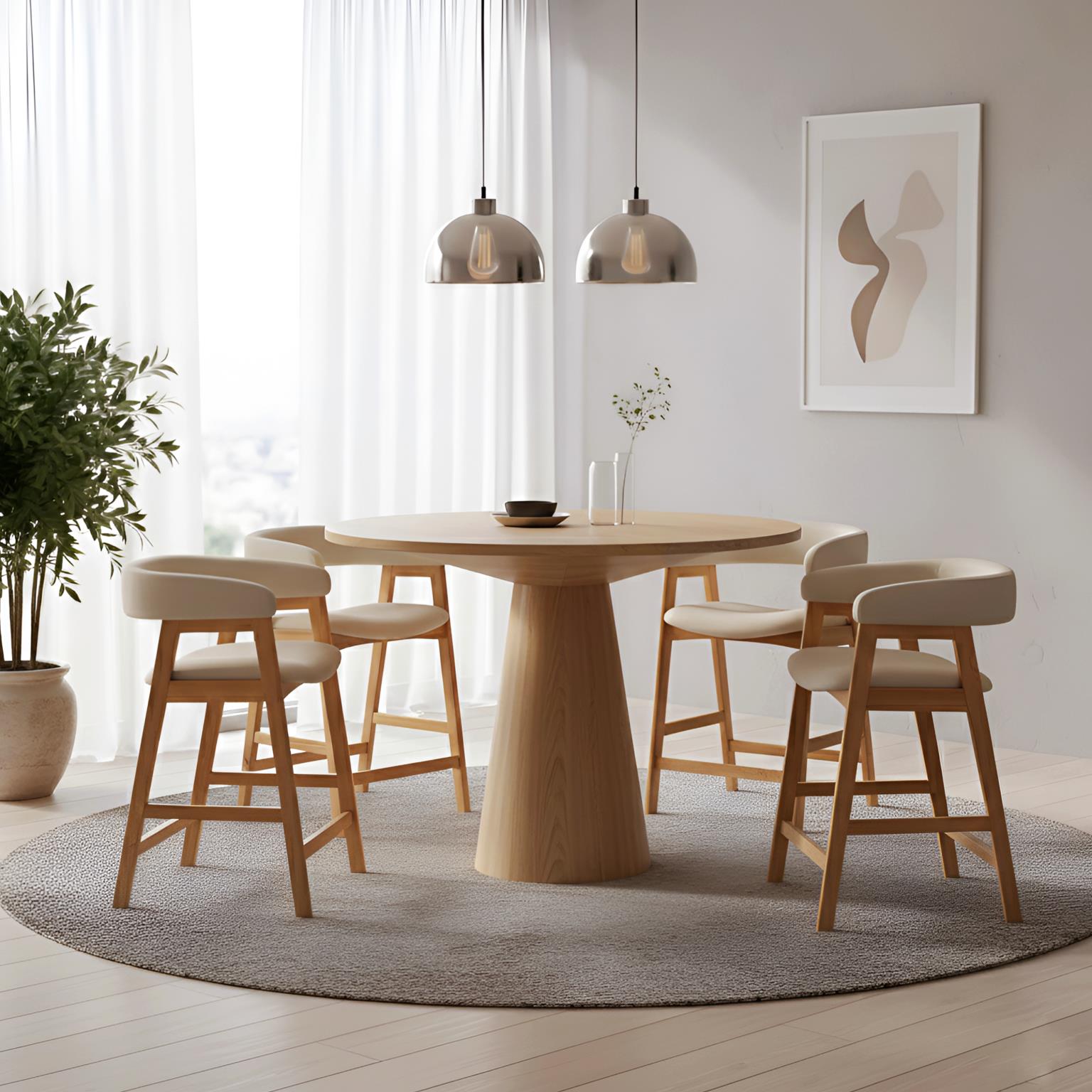 The Cove Counter Height Table in Natural showcases warm simplicity through a softly sculpted, modern form. Its round tabletop and tapered pedestal base create a calm, grounded presence, while the natural wood finish highlights the organic beauty of the grain. Designed for relaxed dining and everyday gathering, Cove brings an inviting, effortless feel to kitchens and casual dining spaces alike. Expertly crafted from solid rubberwood with mindi veneer, this table pairs durability with timeless style, offering a versatile centerpiece that complements both modern and transitional interiors.