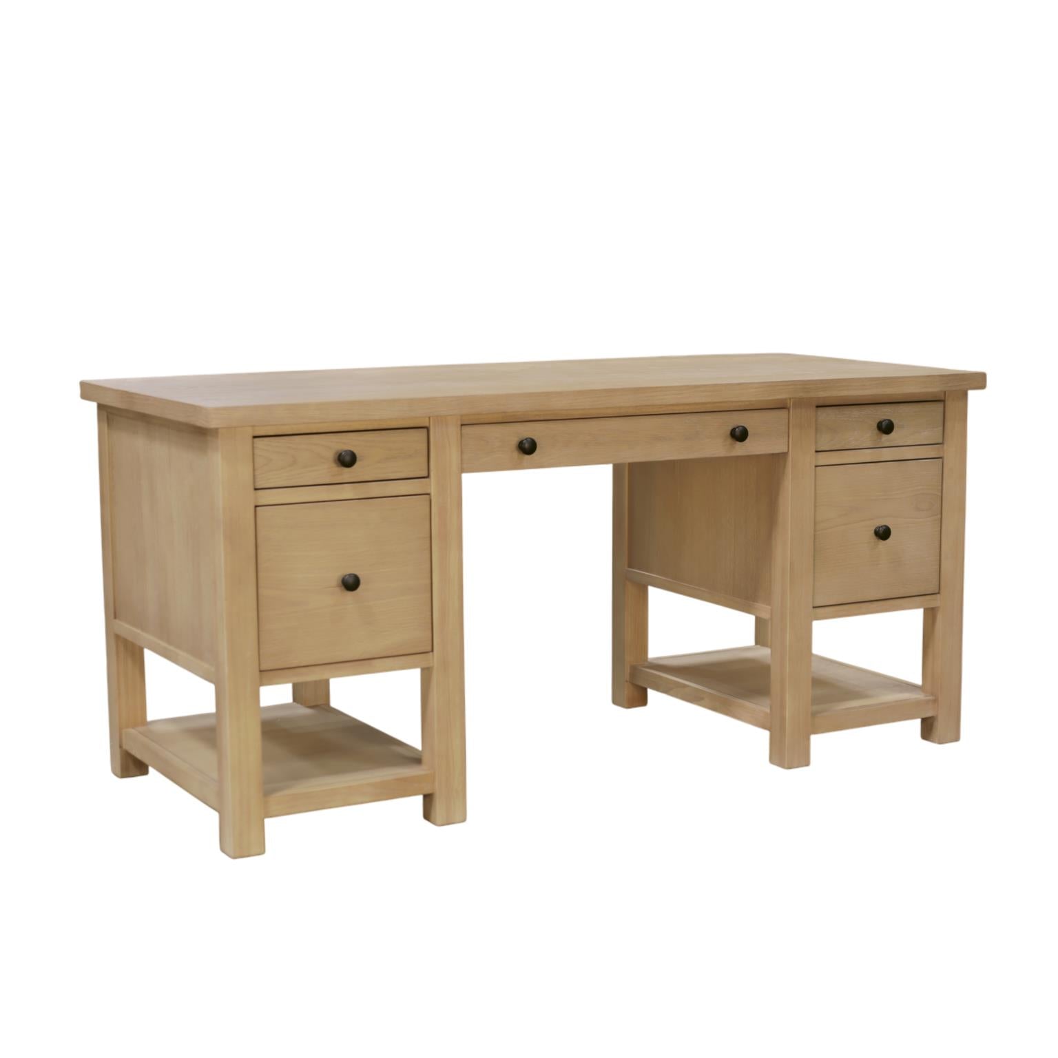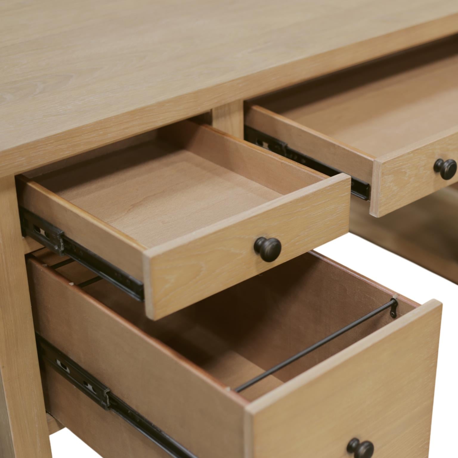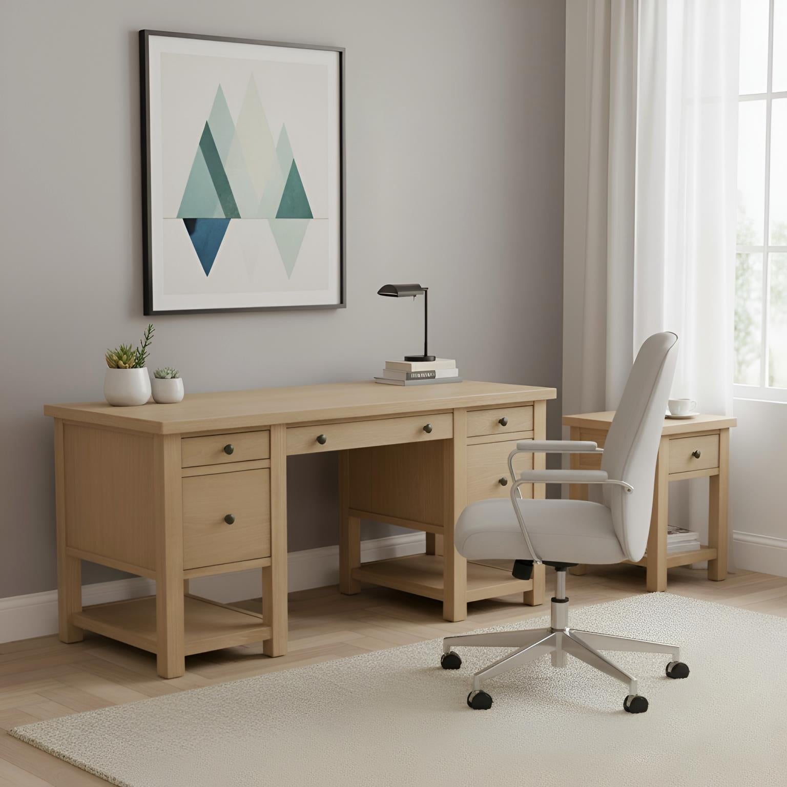 Elevate your workspace with the timeless charm of the Emilia Desk, where modern farmhouse style meets everyday functionality. Crafted from durable rubberwood solids and oak veneer, this desk blends rustic warmth with clean, simple lines that feel at home in any setting. Its fully finished front and back ensure it looks stunning from every angle, whether placed against a wall or floating in the center of a room. With multiple drawers for organized storage and open shelving for added versatility, the Emilia Desk is designed to keep your essentials within reach while offering a spacious surface for work, study, or creativity. Thoughtfully built and fully assembled, it’s ready to inspire productivity and style from the moment it arrives.
